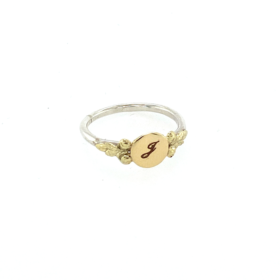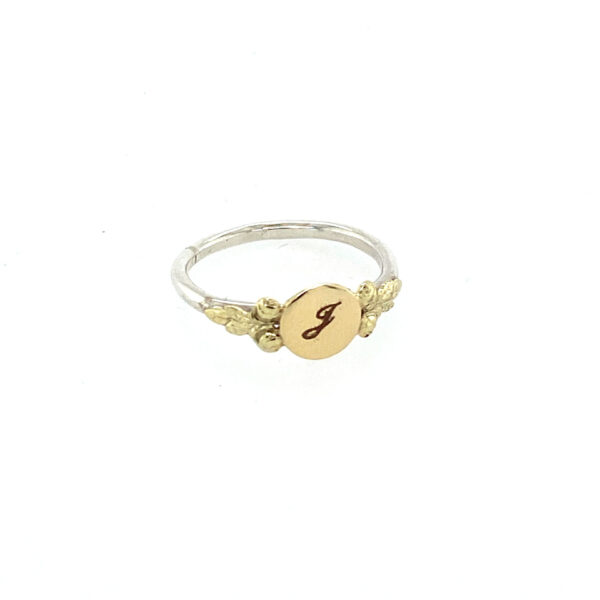 Zilveren ring met gouden elementen en gegraveerde initiaal.