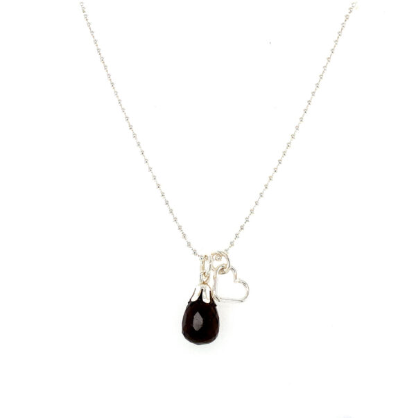 Zilveren balletjes ketting met rookkwarts druppel en open hartje.