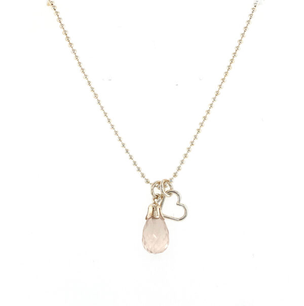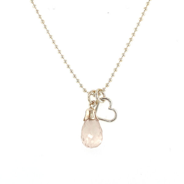 Zilveren balletjes collier met rozenkwarts druppel en open hartje